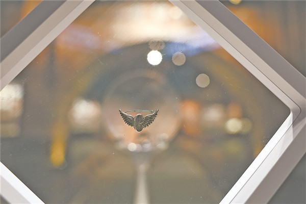 徽章是純銀材質(zhì),寬25毫米,高14毫米,厚1.3毫米,重3克。通過(guò)放大鏡可以看到,其正面以一個(gè)直立的機(jī)車動(dòng)輪為主體,兩側(cè)配以飛翼,組成“飛輪”圖案,象征列車在鐵道上飛馳,被形象地稱為“飛輪”徽章。背面刻有“CHINA”(中國(guó))標(biāo)識(shí)及編號(hào)“669”。