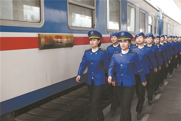 “黑色西裝搭配上藍色條紋領帶,給人一種溫文爾雅的感覺,肩章的取消也消除了彼此的距離感,更能體現‘人民鐵路為人民’服務宗旨。”青島客運段北京動車隊列車長宋思遠說。